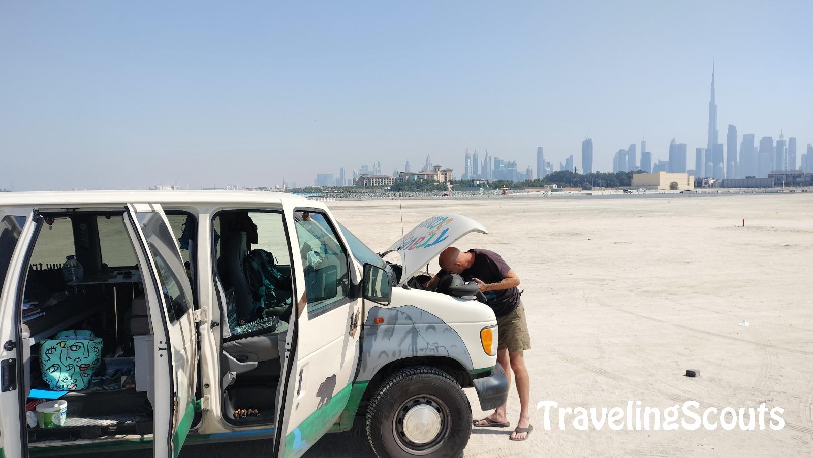 We willen vandaag of morgen vertrekken uit Dubai, maar zijn eigenlijk aan te wachten op een berichtje van twee mensen die we in Medina, Saudi-Arabië hebben ontmoet en rijden nog even naar de Dubai Maill. Helaas merken we dat Henry nog steeds problemen heeft en hebben we een afspraak gemaakt bij een garage die we geadviseerd hebben gekregen. Daar kunnen we in de middag naartoe.